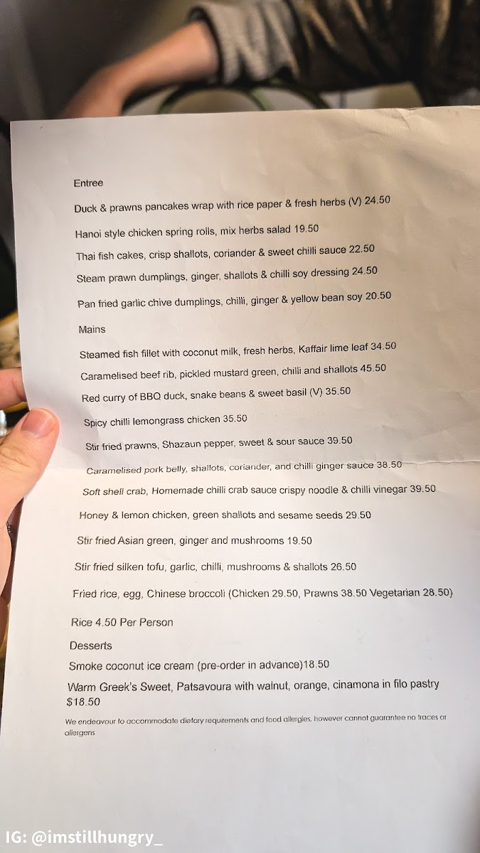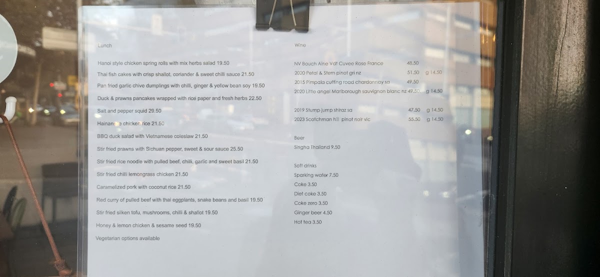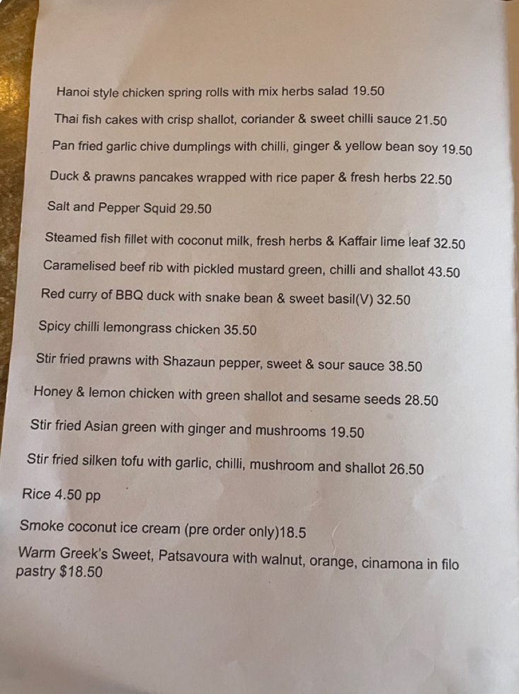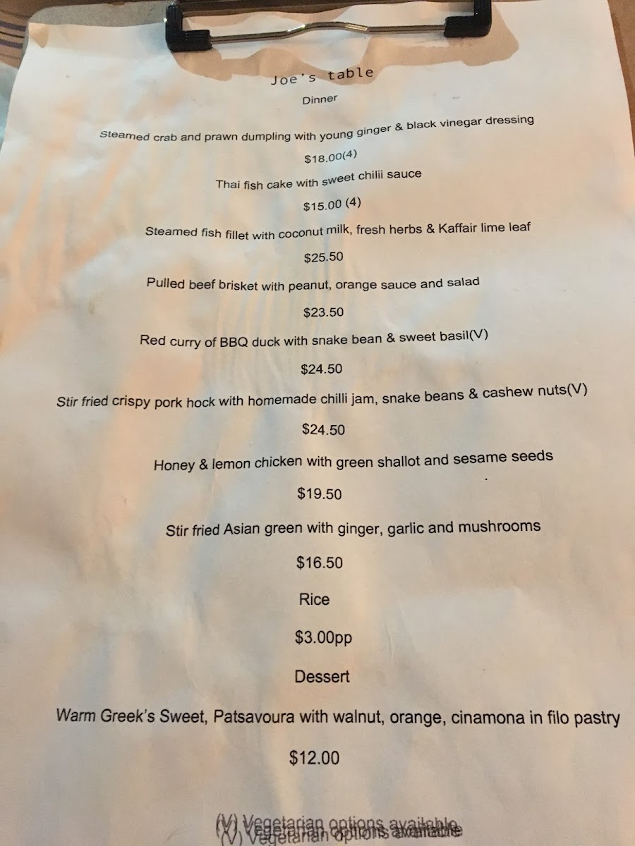 From a reviewer’s perspective, the dinner menu at Joe’s Table delivers a thoughtful and well-balanced snapshot of Southeast Asian-inspired comfort food, bringing together familiar flavors with careful execution. The experience begins strongly with light and vibrant starters such as Hanoi spring rolls with mixed herbs salad, which feel fresh and aromatic, and Thai fish cakes with crisp shallot, peanut & sweet chilli sauce, offering a pleasing contrast between crunch, sweetness, and gentle heat. The pan fried garlic chive dumplings with chilli, ginger & yellow bean soy stand out as a satisfying bridge between entrée and main, with savory depth and fragrant seasoning. Moving into the mains, the menu shows confidence and warmth: steamed fish fillets with coconut milk, fresh herbs & kaffir lime leaf are delicate and comforting, highlighting balance rather than heaviness, while the caramelised beef rib with pickled mustard green, chilli & shallot delivers richness and bold flavor, leaving a lasting impression. Overall, Joe’s Table’s dinner menu feels cohesive and intentional, focusing on quality ingredients, clear flavor profiles, and dishes that complement one another. As a conclusion to the dining experience, this menu reflects a restaurant that values simplicity, authenticity, and consistency, making it an appealing choice for diners seeking a relaxed yet flavorful meal in Darlinghurst.