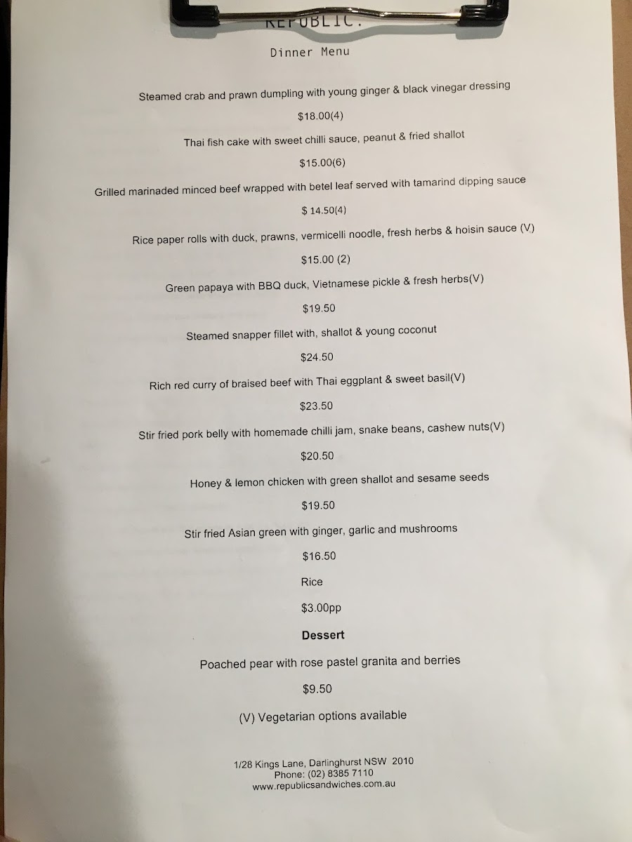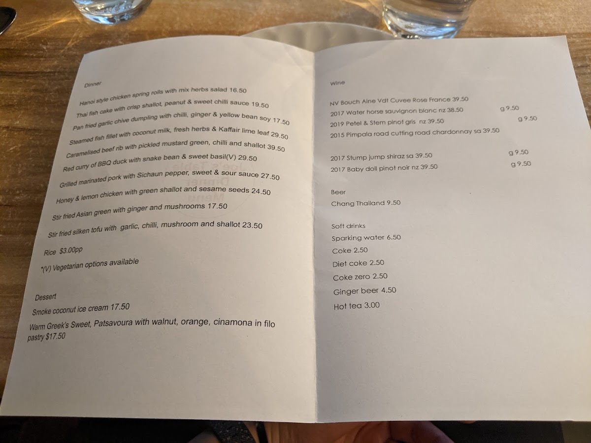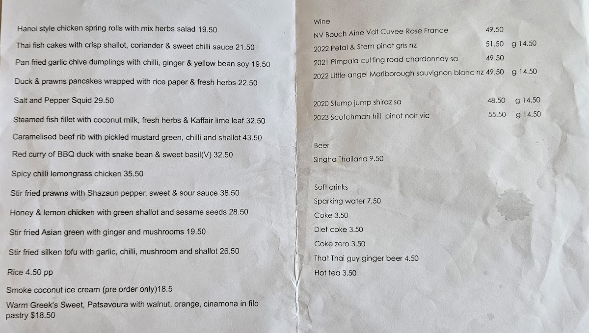 From a reviewer’s perspective, the dinner menu at Joe’s Table delivers a thoughtful and well-balanced snapshot of Southeast Asian-inspired comfort food, bringing together familiar flavors with careful execution. The experience begins strongly with light and vibrant starters such as Hanoi spring rolls with mixed herbs salad, which feel fresh and aromatic, and Thai fish cakes with crisp shallot, peanut & sweet chilli sauce, offering a pleasing contrast between crunch, sweetness, and gentle heat. The pan fried garlic chive dumplings with chilli, ginger & yellow bean soy stand out as a satisfying bridge between entrée and main, with savory depth and fragrant seasoning. Moving into the mains, the menu shows confidence and warmth: steamed fish fillets with coconut milk, fresh herbs & kaffir lime leaf are delicate and comforting, highlighting balance rather than heaviness, while the caramelised beef rib with pickled mustard green, chilli & shallot delivers richness and bold flavor, leaving a lasting impression. Overall, Joe’s Table’s dinner menu feels cohesive and intentional, focusing on quality ingredients, clear flavor profiles, and dishes that complement one another. As a conclusion to the dining experience, this menu reflects a restaurant that values simplicity, authenticity, and consistency, making it an appealing choice for diners seeking a relaxed yet flavorful meal in Darlinghurst.